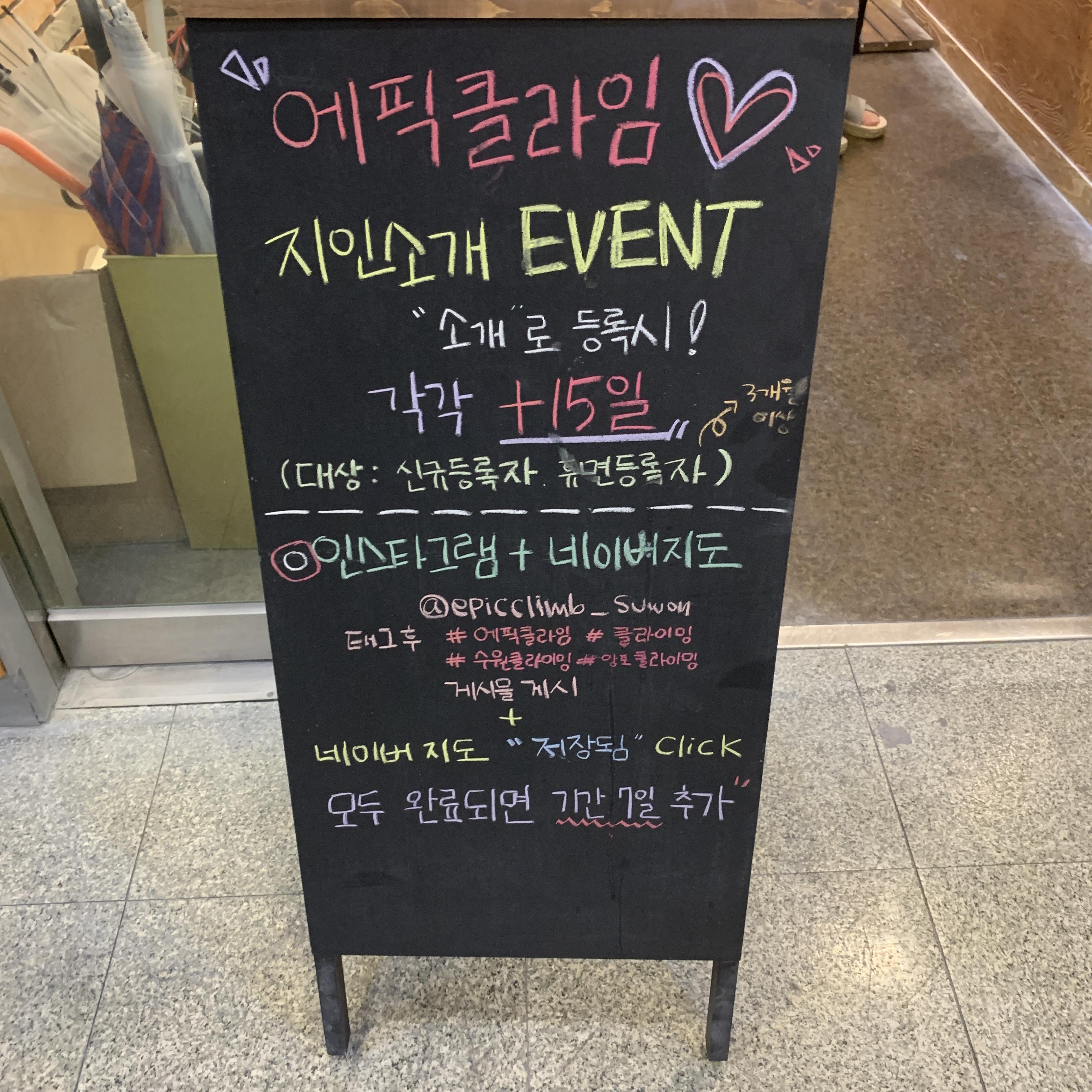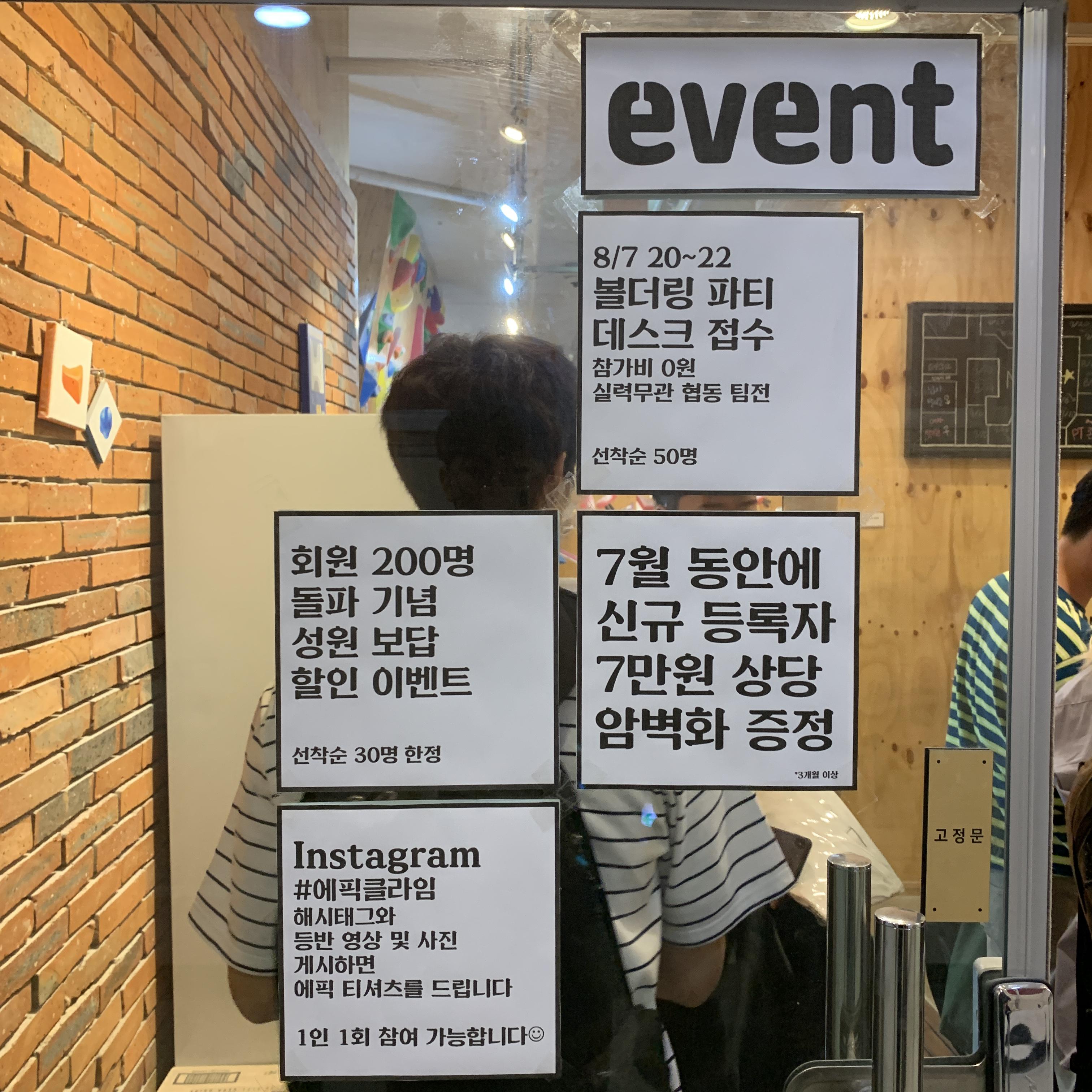 입구에는 다양한 이벤트와 회원권 안내 등이 있습니다.