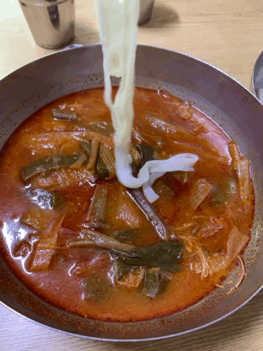 일반 칼국수처럼 면이 처음부터 국물에 담가져서 나오는 게 아니라 약간 일본의 츠케멘?이나 메밀소바처럼 조금씩 넣어먹을 수 있도록 육개장 따로 면 따로 나왔어요.